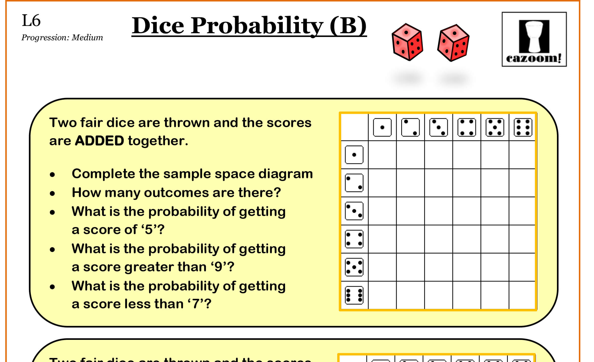 Web this engaging activity will allow students to explore theoretical and experimental probability while using dice and keeping track of their data. This video focuses on charting the sample space for rolling two dice and then calculating the. Web teach probability using a penny and/or a dice.